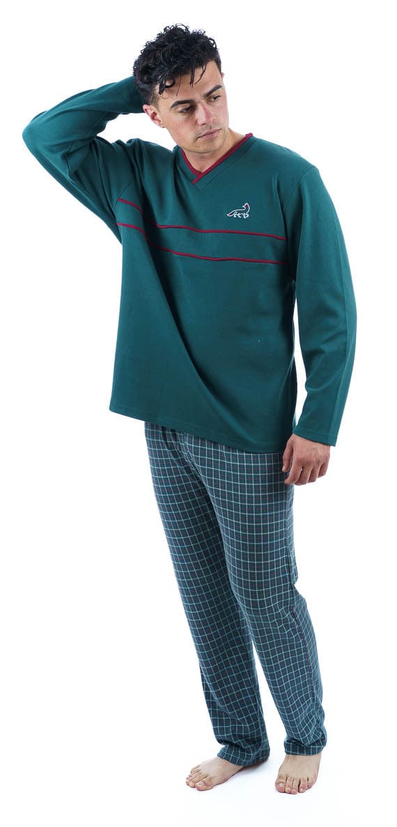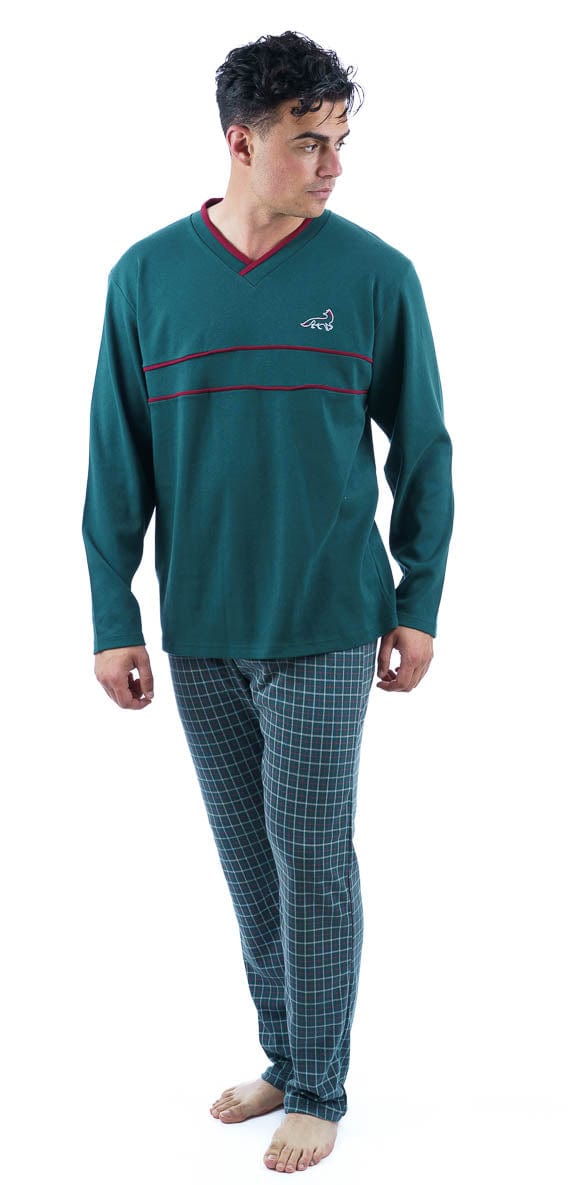 Η ανδρική χειμερινή πιτζάμα αποτελείται απο μπλούζα με V και καρώ παντελόνι.