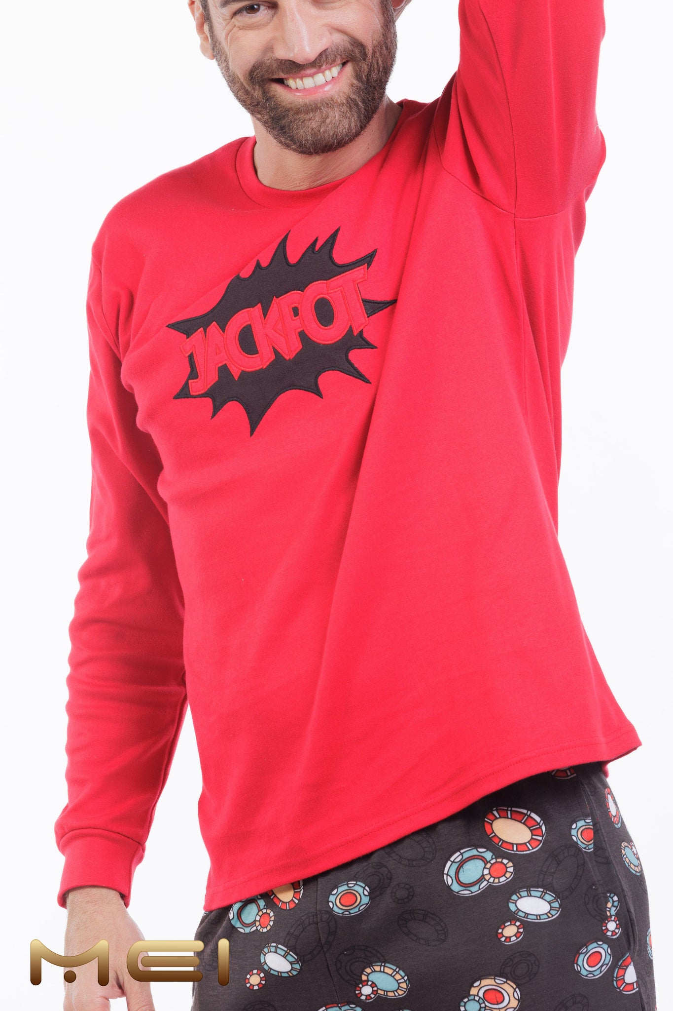 Ανδρική Χειμερινή Πιτζάμα MEI “Jackpot” | Κόκκινη Μπλούζα με Κέντημα & Παντελόνι με Prints Πόκερ | Κωδ. 902545