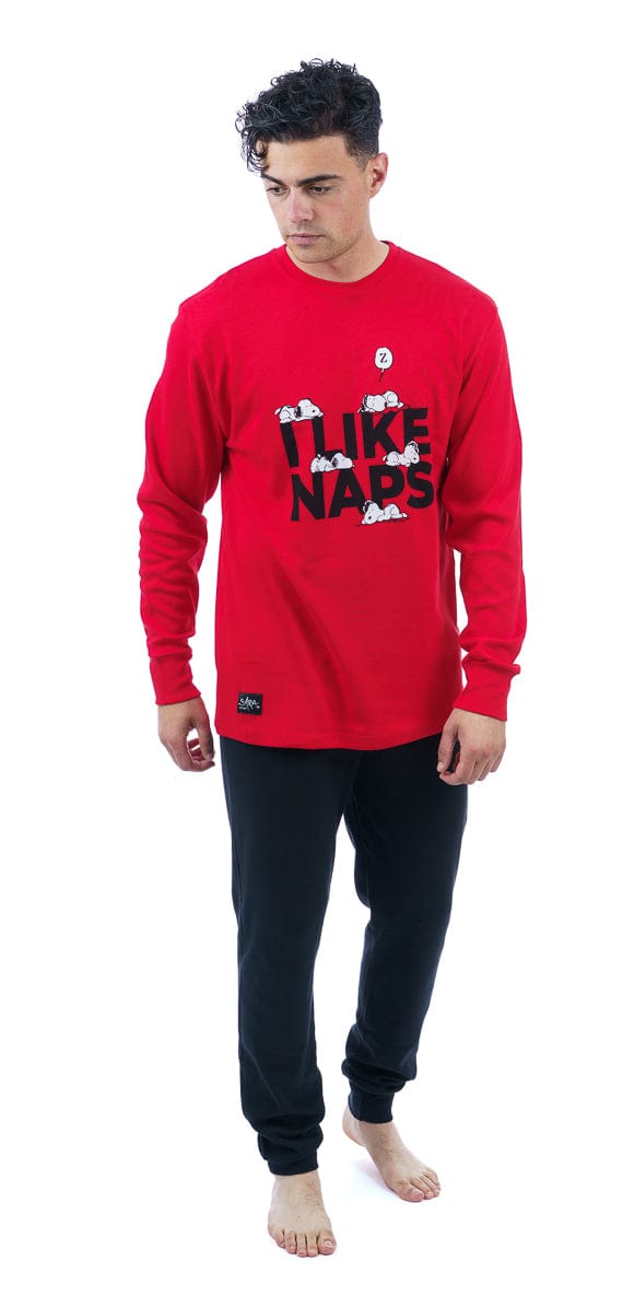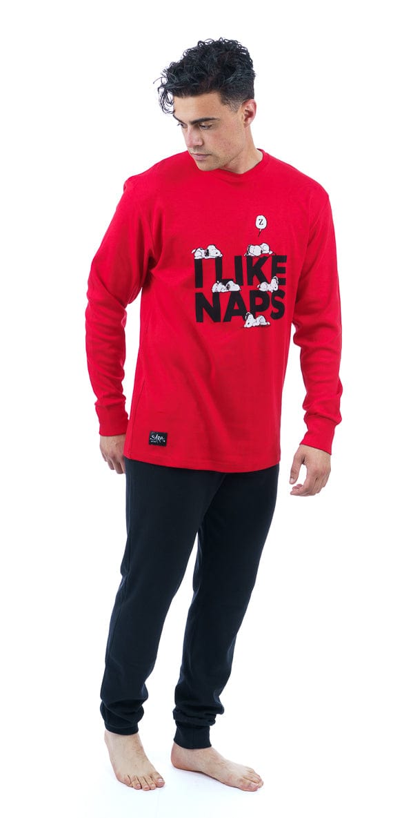 Η ανδρική χειμερινή πιτζάμα αποτελείται απο μπλούζα με σχέδιο "Snoopy" και παντελόνι με λάστιχο στο κάτω μέρος .